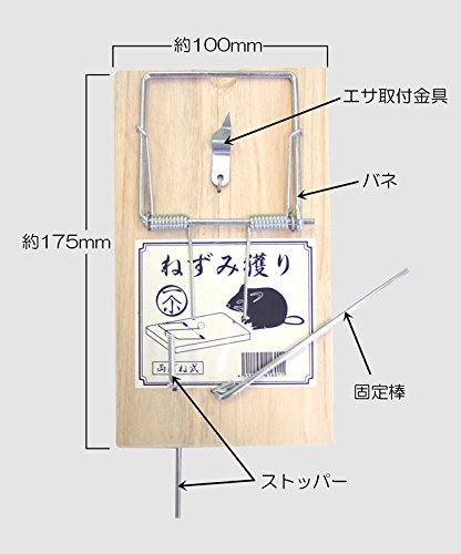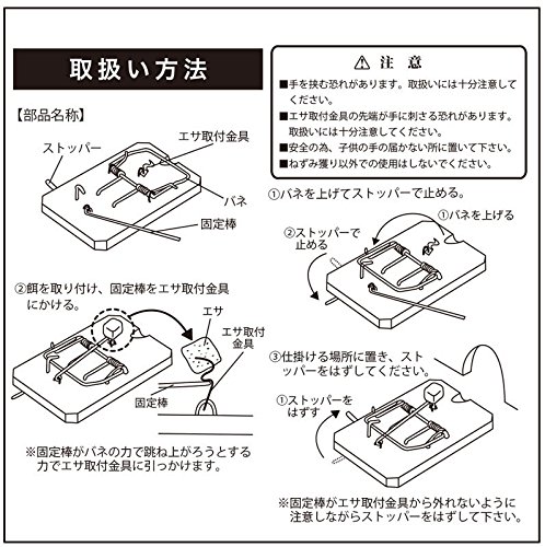 ◆エサ取付金具の先端が手に刺さる恐れがありますので、使用の際は軍手などを着用をお願いします。◆ネズミ獲り以外での使用は絶対にしないでください。