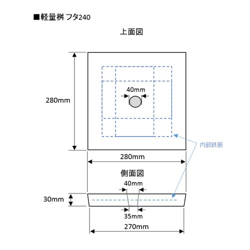 ●「軽量桝本体240」用の蓋(フタ)です。【注意事項】●製造上の寸法誤差が有ります。 ●コンクリート製品のため、お届け時には若干の欠けがございます。●屋外管理品のため、お届け時には汚れや濡れがございます。●凍害や白華現象に対する補償や強度保証は行っておりませんのでご了承願います。●重量物のため、お客様ご都合の返品・交換は行っておりません。