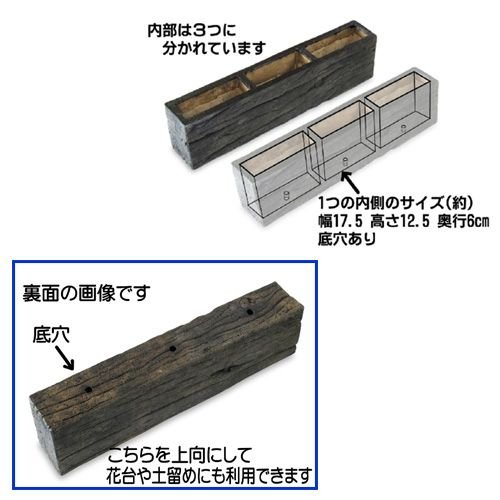 ●枕木をリアルに再現したコンクリート製品です。枕木をくり抜いたような独特の雰囲気が草花を引き立てます。9cmポットなどの小型の草花が植えられます。ひっくり返しても花台や装飾品として利用できます。鉢植え、土留め、縁切り、花台など、アイデア次第でいろいろ楽しめます。【注意事項】雨や水の当たる場所で使用される場合、カルシウム分などが染み出して白華(エフロレッセンス)と呼ばれる現象が起きる場合があります。これはコンクリートやレンガに特有の現象で、製品自体に悪影響はありません。水洗いや白華防止剤などで対処可能です。【返品について】こちらの商品は重量物のため不良品以外の返品はお断りしております。あらかじめご了承下さい。