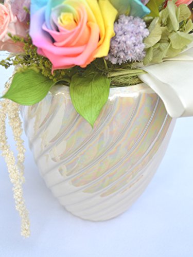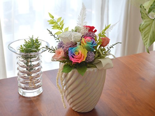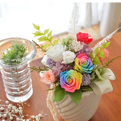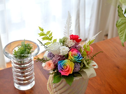 - ・サイズ:最大幅約18cm、最大高さ約25cm 。材料:プリザーブドフラワー:バラ[暗闇で光るバラ大小各1輪][レインボーローズ2輪]他、ストーベ、アジサイ、カスミソウ、丸葉ルスカス、アマランサス、ルスカス、ヤマシダ、リボン 。※レインボーローズはご注文時期により、濃度やグラデーションの度合いが画像と異なる場合がございます。予めご了承くださいませ。