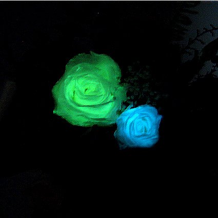 - ・太陽光や蛍光灯の光を15分以上当てると、白バラが暗闇で幻想的に光ります。最初の30分程度が最も発光し、数時間かけて徐々に光が弱くなりますが、また光を当てると何度でも繰り返し発光します。