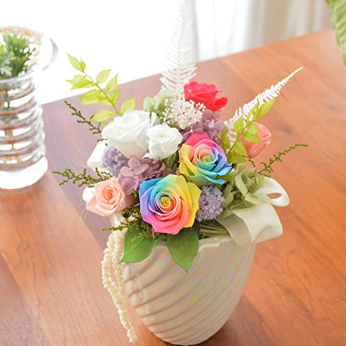 - ・白バラが暗闇で光る!そしてレインボーローズも入ってほんのり香る!!よくばりなプリザーブドフラワーのアレンジメント。