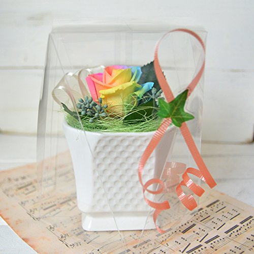 - ・サイズ:幅約8cm、高さ約12cm。 使用花材:【プリザーブドフラワー】レインボーローズ、ローズリーフ(またはレモンリーフ)、ポプラスの実(又はヘデラの実) 【その他】リボン、クリアケース付き(ツイストタイプ 幅(最小値)9cm×高さ15cm)