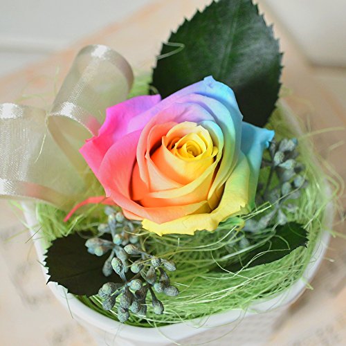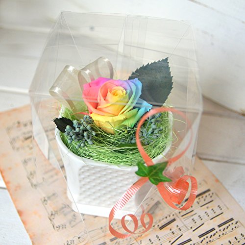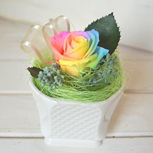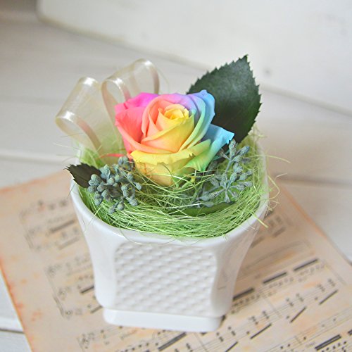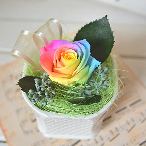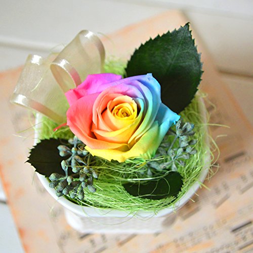 - ・思わず見入ってしまうレインボーローズのプリザーブドフラワーアレンジメント。珍しい七色のバラは贈り物にも最適です。手のひらサイズで可愛いギフト。