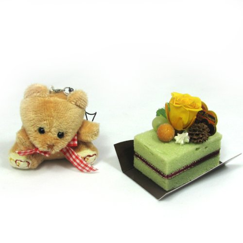 - ・枯れない花、プリザーブドフラワーのミニバラ入りプチケーキとくまのストラップセット。