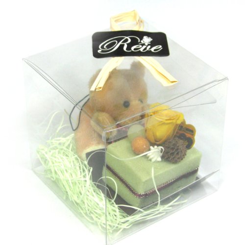 - ・クリアケースサイズ:幅9.5cm、奥行9.5cm、高さ9.5cm。・ケーキサイズ(台紙含む):幅約7cm、奥行約4cm、高さ約5cm。・くま:高さ約7cm。