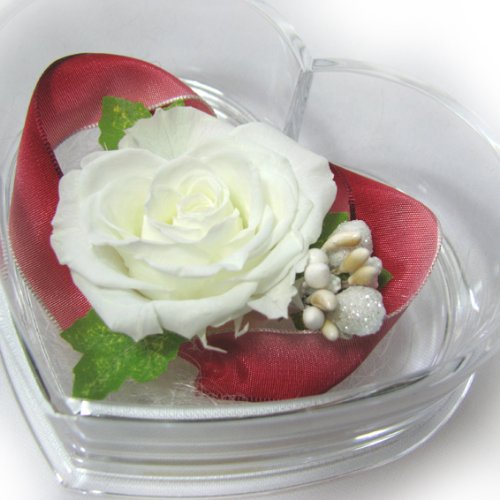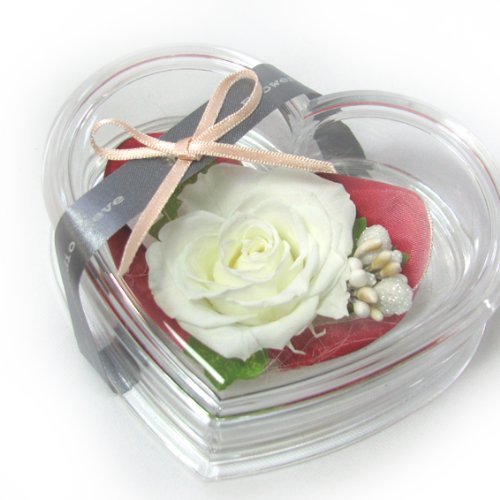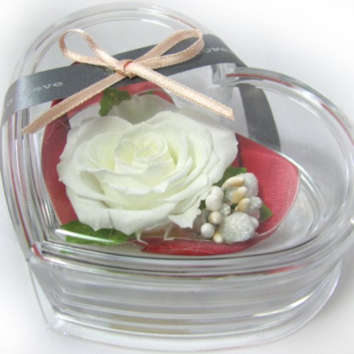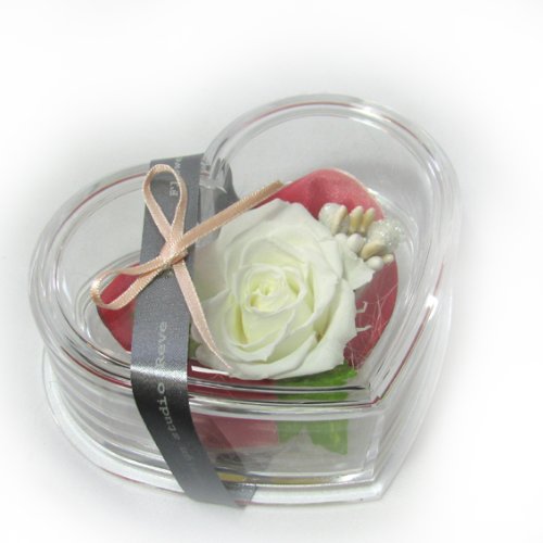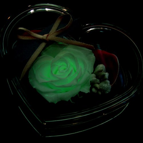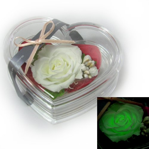 - ・サイズ:12.2cmx10.2cm×高さ5.1cm。材料:光るバラ(プリザーブドフラワー 発光色:グリーン)、リボン、パールピック、ハート型器(アクリル製)