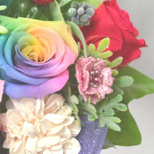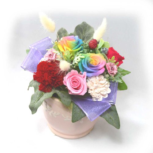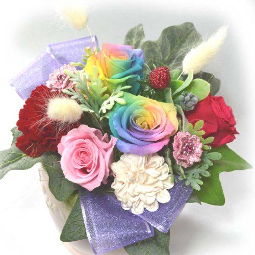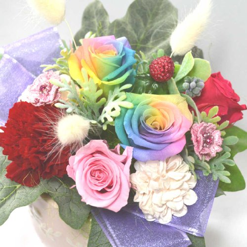 - ・思わず見入ってしまうレインボーローズのプリザーブドフラワーアレンジメント。珍しい七色のバラ贈り物にも最適。