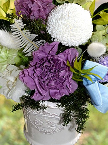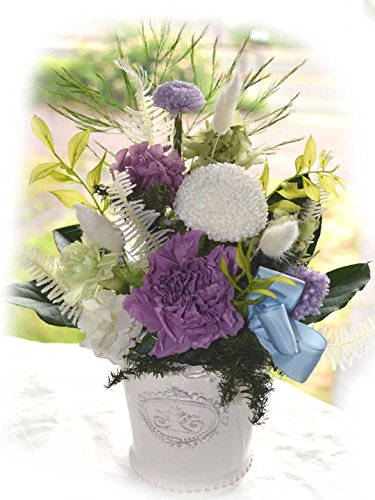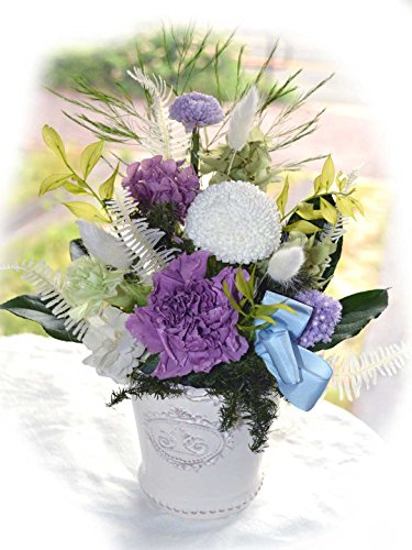 - ・白い陶器製の花器にパープルやグリーン、ホワイト系で統一した清楚なデザイン。