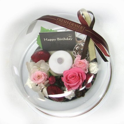 - ・使用花材:【プリザーブドフラワー】バラ、アジサイ【その他】イチゴ、マスカット、ドライの実、シリコンホイップ、シュガーベリー、リーフ、リボン等