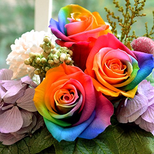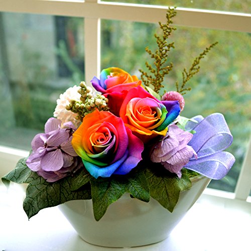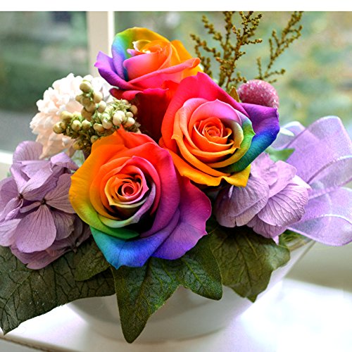 - ・思わず見入ってしまうビビッドなレインボーローズのプリザーブドフラワーアレンジメント。珍しい七色のバラは贈り物にも最適です。