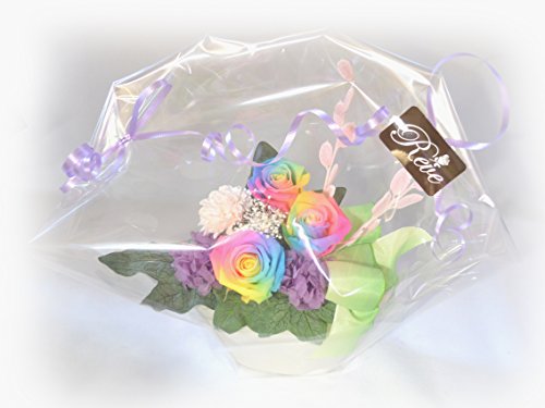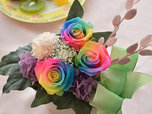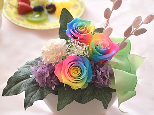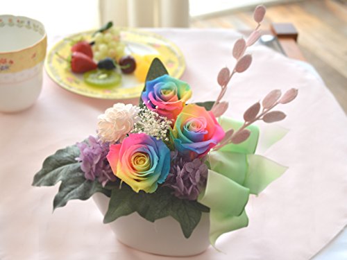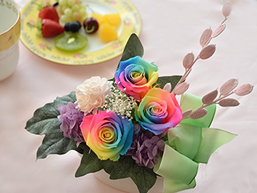 - ・思わず見入ってしまうレインボーローズのプリザーブドフラワーアレンジメント。珍しい七色のバラは贈り物にも最適です。