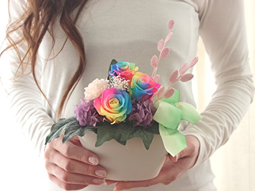 - ・サイズ:幅約17cm、奥行き約10cm、高さ約17cm。 使用花材:【プリザーブドフラワー】レインボーローズ、アジサイ、カスミソウ、フィビキア 【その他】リーフ(アートフラワー)、フェイクカーネ、リボン、花器(陶器製)