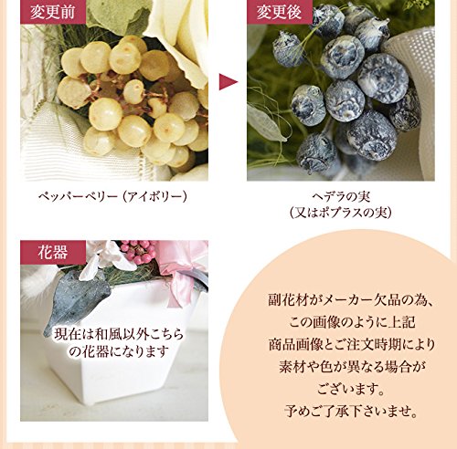 - ・サイズ:最大幅約18cm、最大高さ約25cm。 使用花材:バラ、ストーベ、アジサイ、ライスベリー、ラグラス、ポプラス、ペッパーベリー、パルバフォリア、リボン ※ご注文時期により副素材、花器が画像と異なる場合がございます。予めご了承くださいませ。