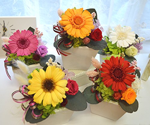 - ・サイズ:最大幅約11cm、高さ約15、奥行き約11cm。使用花材:【プリザーブドフラワー】ガーベラ、バラ、アジサイ、ポプラス、ラグラス(又はポアープランツ)、ライスベリー、千日紅(又はペーパーベリー) 【その他】リボン ※副素材はご注文時期により多少異なる場合もございます。予めご了承下さい。