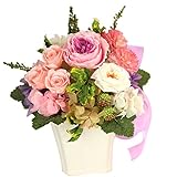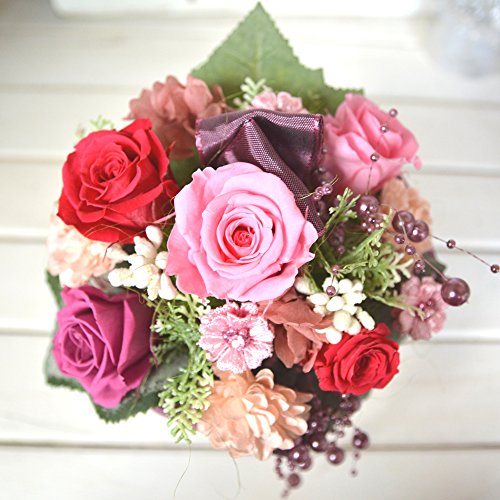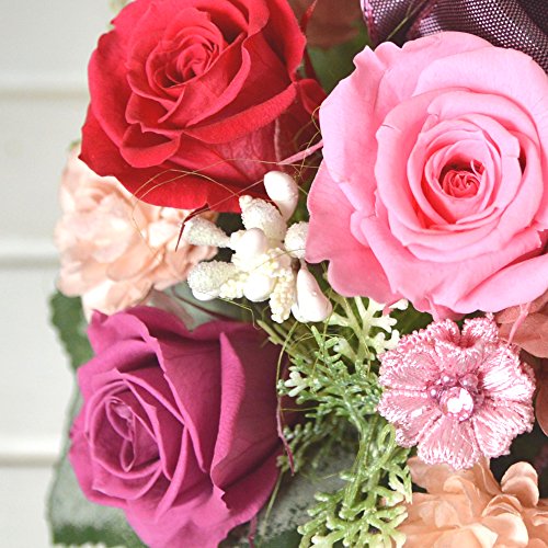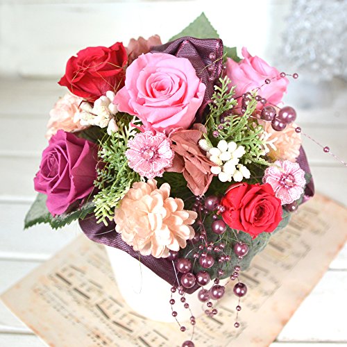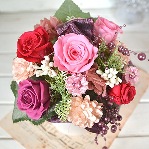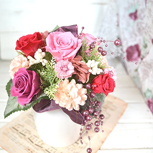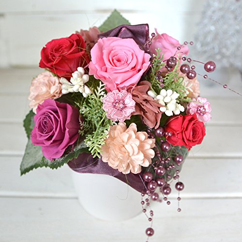 - 使用花材:【プリザーブドフラワー】バラ、アジサイ 【その他】フェイクカーネ、マカロンピック、パールチェーン、フェイクリーフ、ラメベリーピック、リボン他 ※ご購入時期により副素材が画像と多少異なる場合がございます。また花器が角形の場合がございます。予めご了承下さいませ。