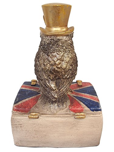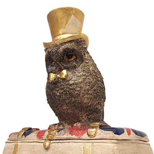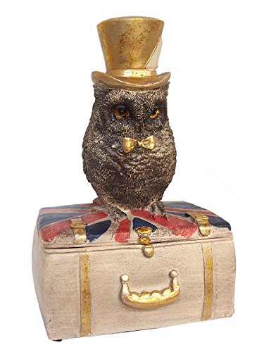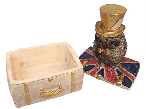 ユニオンジャック柄のトランク型の箱に、ちょこんと乗ったオシャレなフクロウのデザイン。