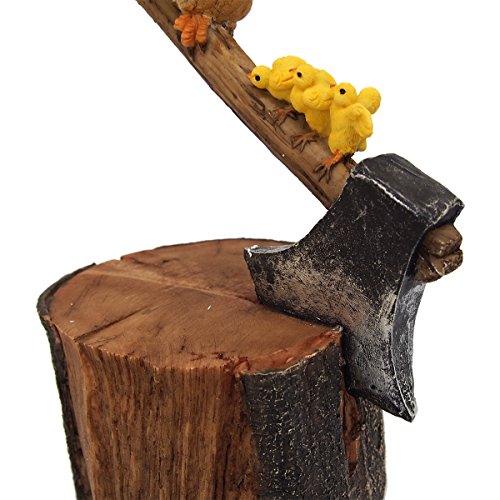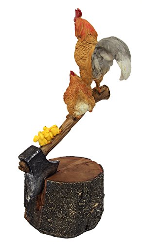 切り株に刺さった斧に乗る鶏たち。