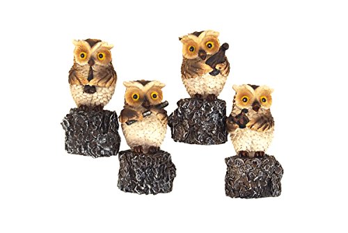 縦笛、横笛、弦楽器、竪琴を持つフクロウたちのデザイン。