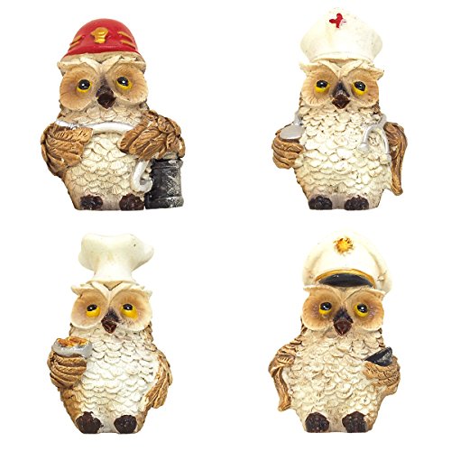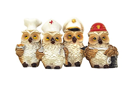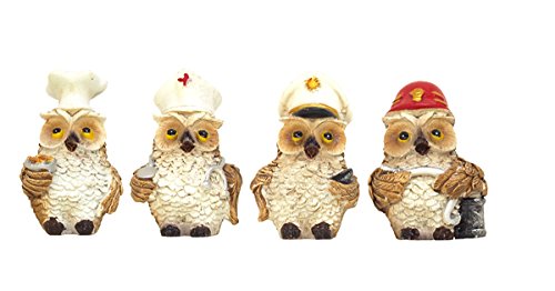 コック、ドクター、船乗り、消防士の格好をしたフクロウたちのデザイン。