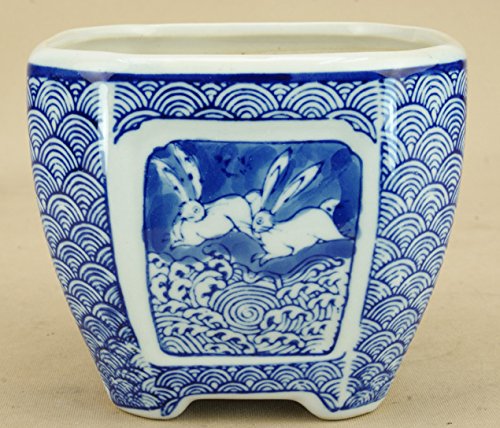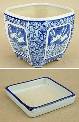 いよじ園 【盆栽鉢】 支那 うさぎ紋 正方角切鉢(受け皿付き)(小品鉢 一辺:10cm)