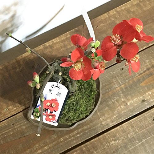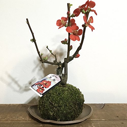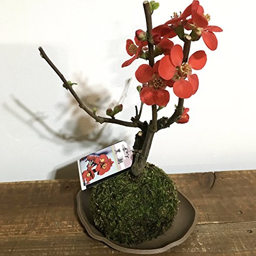 苔玉 ボケ(黒潮) 黒潮(クロシオ)は、黒紅色の中輪単色花で、一重咲き、寒咲き種です。花形はくっきりしていて、とげはありません。開花時期は3~5月です。 苔玉の育て方 苔玉の育て方のポイントは、何と言っても水やりタイミング! ・目で見て苔が白っぽく乾燥している。 ・苔を触ってみてカサカサしている。 ・苔玉を持ち上げたら軽い! 上記のような状態でしたら、水やりを行ってください。 水やりの方法 苔玉の中まで、水がしっかり届くように水の中につけ、沈んだら水やりOKです。 苔玉を取り出したらかるく水を切ってお皿に戻します。 常に水を含んでいるより、乾いてから水を与える様にして下さい。 苔玉の置き場所 日光に当たることによって緑色のふかふかした苔に成長していくので、日光がよく当たる室内の窓辺に置いて下さい。 また、時々窓を開けて風に当ててあげるとより元気に育ちます。 2~3日ごとに屋外に出して外の空気に触れさせもOKです。 苔玉のサイズ:9-15cm 高さ:15-25cm ※全品皿付き ※写真は参考写真(見本)になります。 ※植物ですので多少の個体差があります。時期によって画像にある花や実、葉は付いてない場合があります。