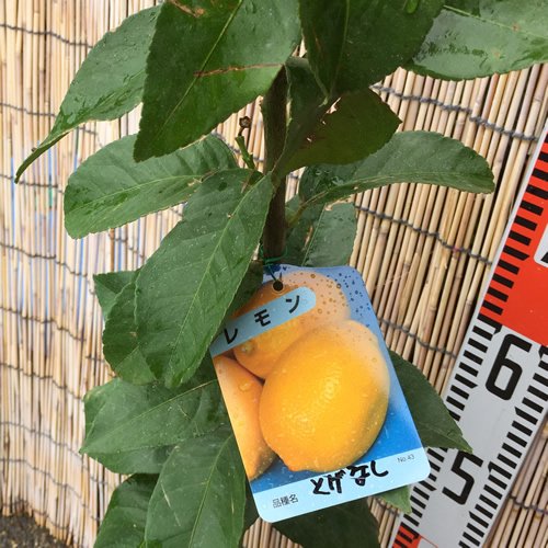 レモン 苗木 トゲなしレモン 13.5cmポット苗 れもん 苗 檸檬 トゲなしレモン最大の魅力はなんといっても「トゲ」がないことです。 ◆トゲがなく、非常に育てやすいです◆ 従来のレモンには長く鋭いトゲがあるのに対して、トゲなしレモンのトゲは、その1/3の長さ1.5cm。しかも、成長するにつれて、そのトゲもだんだん無くなっていきます。 単に世話が楽というだけでなく、トゲで果実そのものを傷つけてしまうということも少ないのが利点です。 新葉も素晴らしいレモンの香りがします。白い花も甘い香りがし、季節を通して楽しめます。 ◆育て方◆ 耐寒性・耐暑性が比較的高く、育てやすい品種です。レモンは寒さにやや弱いのですが、暖地と太平洋側の一般地なら露地栽培できます。 花の香りもよく、庭木として鑑賞用に使っても素敵です。-3度以下にならない場所なら戸外で冬越しできます。 3月から6月ごろまでが植え付け適期です。鉢植えの場合は、大きめの鉢を選ぶと、それだけ成長し、育つ実も大きくなります。 庭植えでも鉢植えでも、夏に水を切らすことがないよう注意してください。 幼木のときにはトゲに注意が必要です。 自家結実性があるので、1本で実をつけます。 最終樹高:2~3m 収穫期:10~3月 栽培適地:新潟県、福島県~沖縄県 ※写真は参考写真(見本)になります。 ※植物ですので多少の個体差があります。 時期によっては花や実、葉は付いてない場合があります。