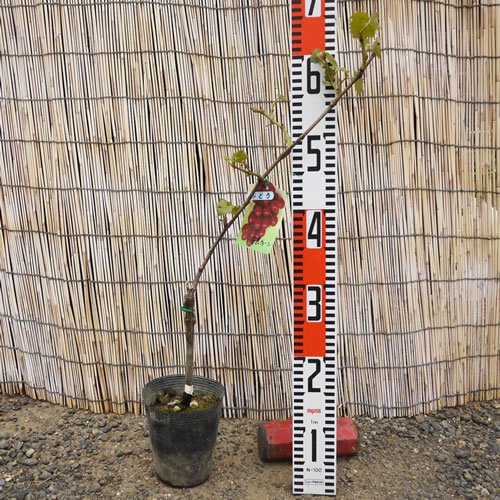 ぶどう 苗木 安芸クイーン 12cmポット苗 あきクイーン ブドウ 苗 葡萄 安芸クイーンは両親が巨峰で、自家受粉した巨峰の実生から育成され、1993年に登録された品種です。 ◆『クリスタル・ローズ』とも呼ばれる幻のぶどう◆ 果皮はあざやかな紅色です。 果肉は硬すぎず、もろくもなく、適度にしまり、良い食感です。果汁も豊富です。甘みは強く、酸味は控えめの、香りがよい赤系ブドウです。 別名「クリスタル・ローズ」ともよばれます。粒のサイズは巨峰と同じくらいです。日持ちが良いのも魅力です。 自家受粉しますので、1本で実がつきます。 ◆育て方◆ ぶどうは湿気の多い環境を嫌います。庭植えの際は、水はけの良い場所に植えて下さい。 真夏に日照りが続くとき以外は、特に水やりの必要はありません。鉢植えの場合は、乾いたときに水をやる程度で十分です。 開花数日前に花房を整理し、開花が終わって10~14日ごろに、房を摘み取って葉10枚あたり1花房程度に(摘房)します。摘房後は摘粒(密着している果実を除いて個々の粒が良く育つようにする)をします。少なめにしたほうが順調に生育します。 結実した実には袋をかけ、病虫害や鳥害から守ります。 安芸クイーンは接木苗です。 収穫時期:9月 最終樹高:2~2.5m 植栽適地:青森~沖縄 ※写真は参考写真(見本)になります。 ※植物ですので多少の個体差があります。 時期によっては花や実、葉は付いてない場合があります。