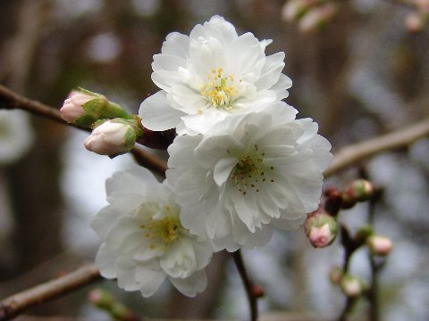 大阪冬桜 白の八重咲き は秋と春の2回花を咲かせる早咲き品種で 清楚な白い花を長い期間楽しむことができます。 また、耐寒性のある品種なので、寒地での栽培にも適した品種です。