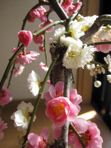 梅 紅白に咲く おめでたい しだれ梅 ピンクと白の 八重咲きの 梅が かわいい シダレ梅です。