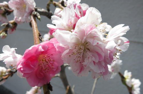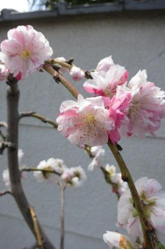 - 白地に紅絞りのしだれ桃、八重咲き花桃です。枝垂れの樹形も美しく、庭園樹、鉢植えでも 育てる事ができます