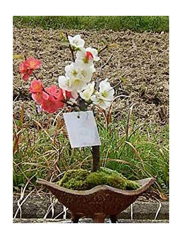 数量物の為、若干樹形・が異なる場合がございます。 木瓜(ぼけ)バラ科の落葉低木。別名が放春花といい 贈り物に最適な 縁起の良い ボケ盆栽 花の開花は 二月~三月 毎年奇麗な花が咲き とても 育てやすい樹種です。 信楽鉢入りで 高さは 約20センチ前後です。 開花時期が 過ぎますと 葉での 鑑賞 冬は 葉が落葉します。 ボケの花言葉は 「妖精の輝き」とも言われています。 ボケ盆栽の 育て方は こちらより ボケは放春花とよばれ春に早くに咲く 春を招くことから縁起のよいお花です 花色も可憐な花を咲かせ 日本の気候にもなじみやすく、初心者でも育てやすいことから、鉢植えや盆栽としても楽しまれています 「ボケ 日月星」は、古くから人気のある名花です。 咲き分けのお花で、純白の地に紅の絞りが鮮明に入ります。 ボケの渡来時期は、平安初期以前であるとされます。 その後、大正時代に、新潟県新潟市と埼玉県川口市を中心としたブームが起こり、代表的な 東洋 錦や日月星(じつげつせい)が作出されました。 バラ科の落葉低木 i庭木として 育てる場合成長すると 1~1.5m位に育ちます 耐寒性 強 く栽培場所 日向向きです ボケの花言葉としまして 「先駆者」「指導者」「妖精の輝き」「平凡」 ボケはたくさんの花言葉をもっていますが、どれも由来や意味は伝えられていません。 ただ、「先駆者」という花言葉は、織田信長が家紋としてボケを用いていたことに 由来しているとされています。