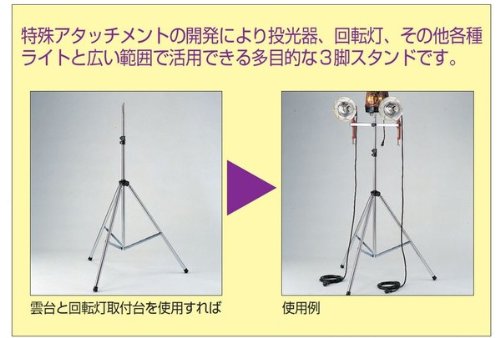 特殊アタッチメントの開発により投光器、回転灯、その他各種ライトと広い範囲で活用できる多目的な三脚スタンドです!