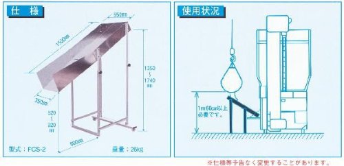 フレコンシューター FCS-2 の特徴 フレコンバッグから米(籾)を乾燥機に投入する際の滑り台です。 フレコンを使った張込作業を補助します。 流穀部がステンレスのため、籾の流れが円滑です。 流穀部が長く、高さ調整も可能です。 キャスター付きで移動も簡単。 シュート部:ステンレス製 シューターサイズ:幅550mm(先端幅:350mm)×長さ1500mm 高さ:1350mm?1740mm(先端部高さ:520mm×920mm) 重量:26kg