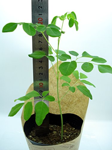 - モリンガ(ワサビノキ)の苗で、ポットの直径は10.5cmです。乾燥に耐えるため、細かく多く の小さな葉に分かれています。