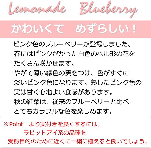 ノーザンハイブッシュ系とラビットアイ系のハイブリット品種 Pink Lemonade Blueberry ピンク色のブルーベリーが登場しました。 春にはピンクがかった白色のベル形の花をたくさん咲かせます。 やがて薄い緑色の実をつけ、色がすぐに淡いピンク色になります。熟したピンク色の実は甘く心地よい食感があります。 秋の紅葉は、従来のブルーベリーと比べ、とてもカラフルな色を楽しめます。 ※Point より実付きを良くするには、ラビットアイ系の品種を受粉目的のために近くに一緒に植えると良いでしょう。 日照:日向 開花時期4月頃 結実時期:7?8月 結実年数:2?3年 草丈:150?200cm 耐寒性:強
