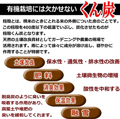 籾殻とは、精米のときにとれる米の外側についた皮のことです。 この籾殻を400度以下の低温でいぶし、炭化させたものが籾殻くん炭となります。天然の土壌改良資材としてガーデニングや農業の現場で活用されます。雨によって徐々に成分が溶け出し、穏やかに作用することが特徴です。 脱臭炭のように臭いを吸着する作用があり、腐葉土や堆肥の臭いを緩和してくれます。 土壌改良:保水性・通気性・排水性の改善・酸性を中和する 肥料:土壌微生物の増殖 消臭効果:脱臭炭のように臭いを吸着する作用があり、腐葉土や堆肥の臭いを緩和してくれます。 保温や融雪効果:植物を寒さから守る