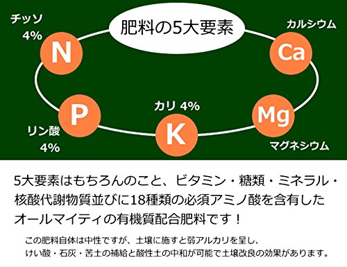 - 5大要素はもちろんのこと、ビタミン・糖類・ミネラル・核酸代謝物質並びに18種類の必須アミノ酸を含有したオールマイティの有機質配合肥料です。