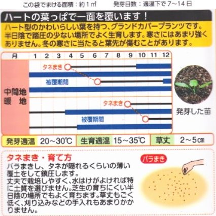 - 草丈2~5cmほどで、ハート型の美しい葉を有し、地上をほふく茎で広がり生長が早い。