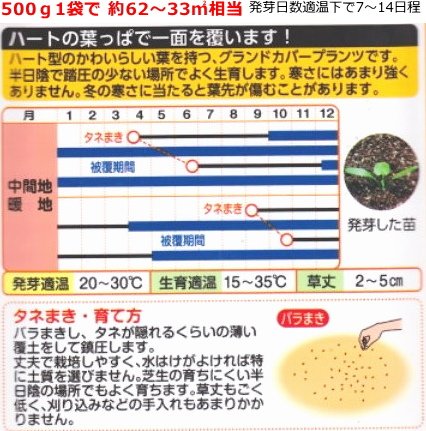 - 草丈2~5cmほどで、ハート型の美しい葉を有し、地上をほふく茎で広がり生長が早い。