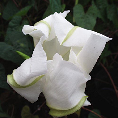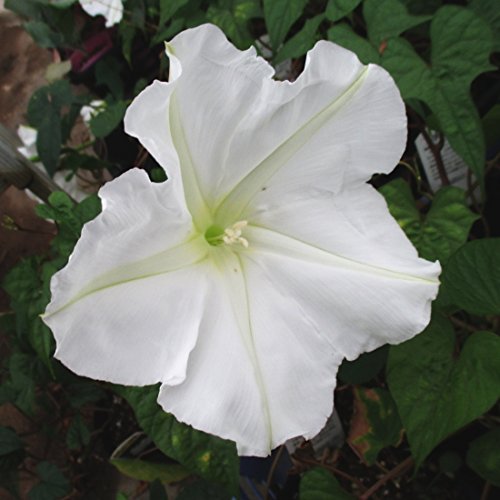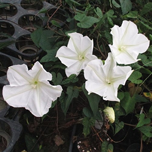 - 朝顔に似たラッパ状の白花が香りを伴い、夕に咲き始めるつる性植物です。