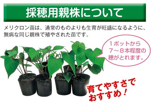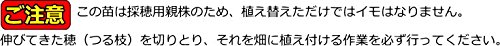 - この苗は採穂用親株のため、植え替えただけではイモはなりません。伸ばした穂を切りとり、その穂を畑に植え付ける作業を必ず行ってください。