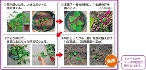 日中は25℃、夜温は15℃に保つような環境で栽培お願いします。温度が低いと生育が遅れますので、ご注意ください。また、この苗は採穂用親株のため、植え替えただけではイモはなりません。伸ばした穂を切りとり、その穂を畑に植え付ける作業を必ず行ってください。苗がお手元に到着しましたら、ご対応よろしくお願いします。