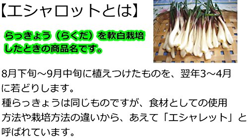 - 【エシャレットは】 らっきょう(らくだ)を軟白栽培したときの商品名です。8月下旬~9月中旬に植えつけたものを、翌年3~4月に若どりします。種らっきょうは同じものですが、食材としての使用方法や栽培方法の違いから、あえて「エシャレット」と呼ばれています。