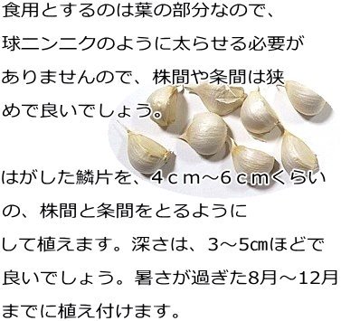 - 食用とするのは葉の部分なので、球ニンニクのように太らせる必要がありませんので、株間や条間は狭め良いでしょう。はがした鱗片を、4~6cmくらいの、株間と条間をとるようにして植えます。深さは、3~5cmほどで良いでしょう。暑さが過ぎた8月~12月までに植え付けます。