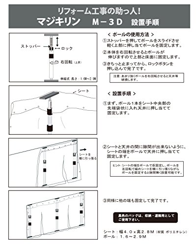 リフォーム工事シート マジキリン 品番:M-3D シート:1枚 ポリエチレン製 白色半透明 幅4.0Mx高2.8M ファスナー2カ所付 ポール:3本 回転スライド式 長さ1.6Mから2.9M 収納バッグ:1枚 厚手不織布製