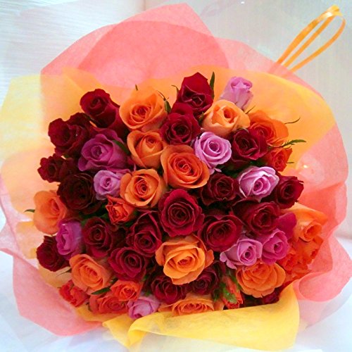 長さ約50センチのボリュームがある色とりどりのバラのブーケ!50本もあるバラをもらったら・・・どれくらいうれしいか想像もつきませんね♪絶妙なグラデーションは、どんな方にも喜ばれるにぎやかで華やかな花束です。用途(一例):記念日 誕生日 フラワーギフト 生花 新築祝い 開店祝い 還暦 祝い 誕生日 プレゼント 生花 お彼岸 お見舞い 退職祝い 男性 女性 アレンジフラワー