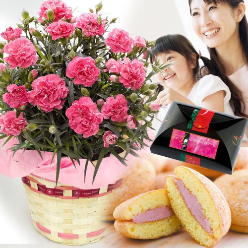 長く楽しむことができる鉢植えのカーネーションとイチゴの風味が溢れるクリームサンドのセットです。母の日特製ピックをお付けしてお届けします。