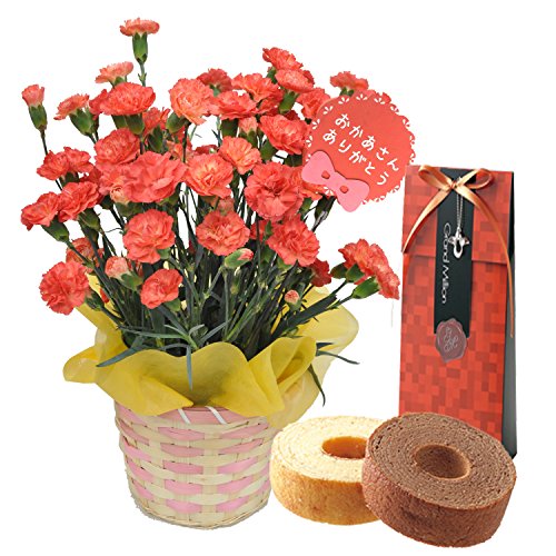 母の日 花とスイーツ ギフト カーネーション 鉢植え 5号鉢 オレンジ グランミリオン バウムクーヘン セット プレゼント 用 ギフト ボックスでお届け