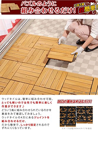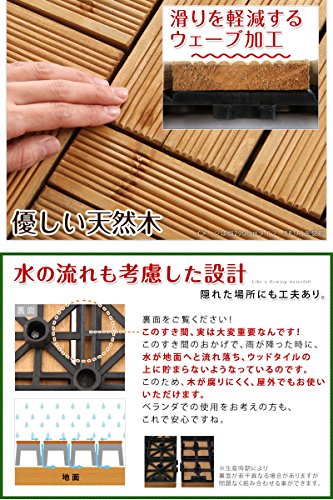 あなたはウッドタイルという商品をご存知ですか? 名前の通り、天然木をタイル状にしたものです。 ウッドタイルの特徴は、その保温性の高さです。 コンクリートの地面とは比べ物にならないくらいの温かみがあります。木は木陰を作り、風よけとなり、そして、地面をもつくる。 木は、あなたのそばにいつもいる。木の温もりを足元から直に感じられ居心地抜群の空間をつくります。 天然木を使用しているため、多少のささくれがございます。素足でのご利用はご遠慮くださいませ。 2010年5月より仕様変更のため、5月以前にご注文頂いた分とサイズが異なっております。 追加でご注文の際は一度お問い合わせを下さいませ。 ※この商品はリサイクル資材を使用しての梱包・発送となります。ご了承くださいませ。